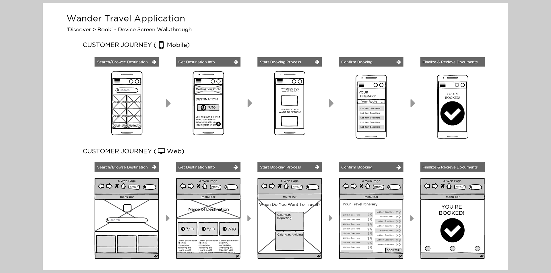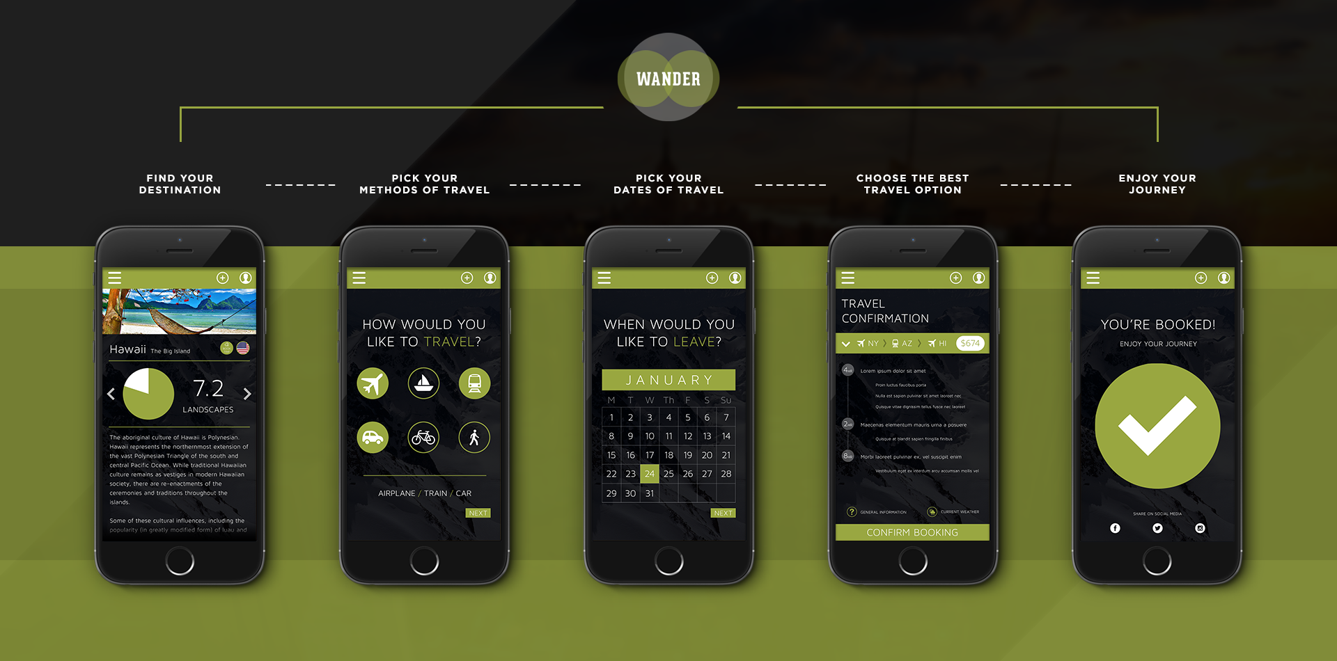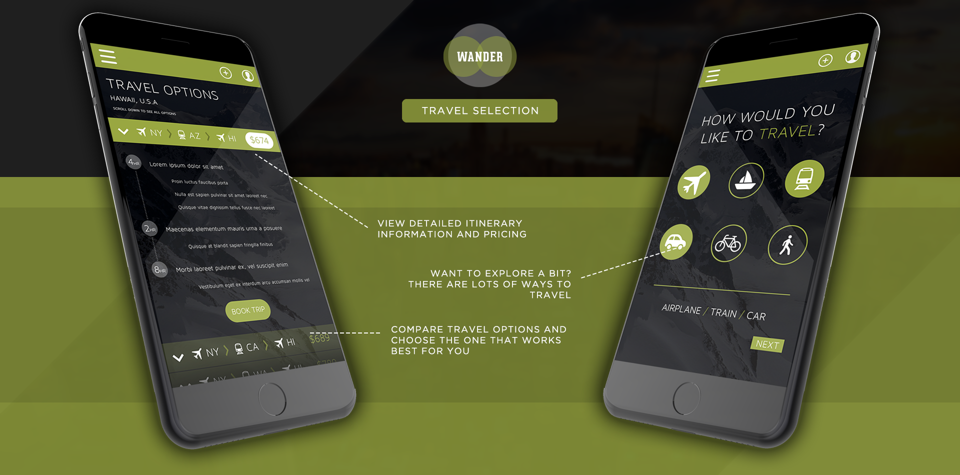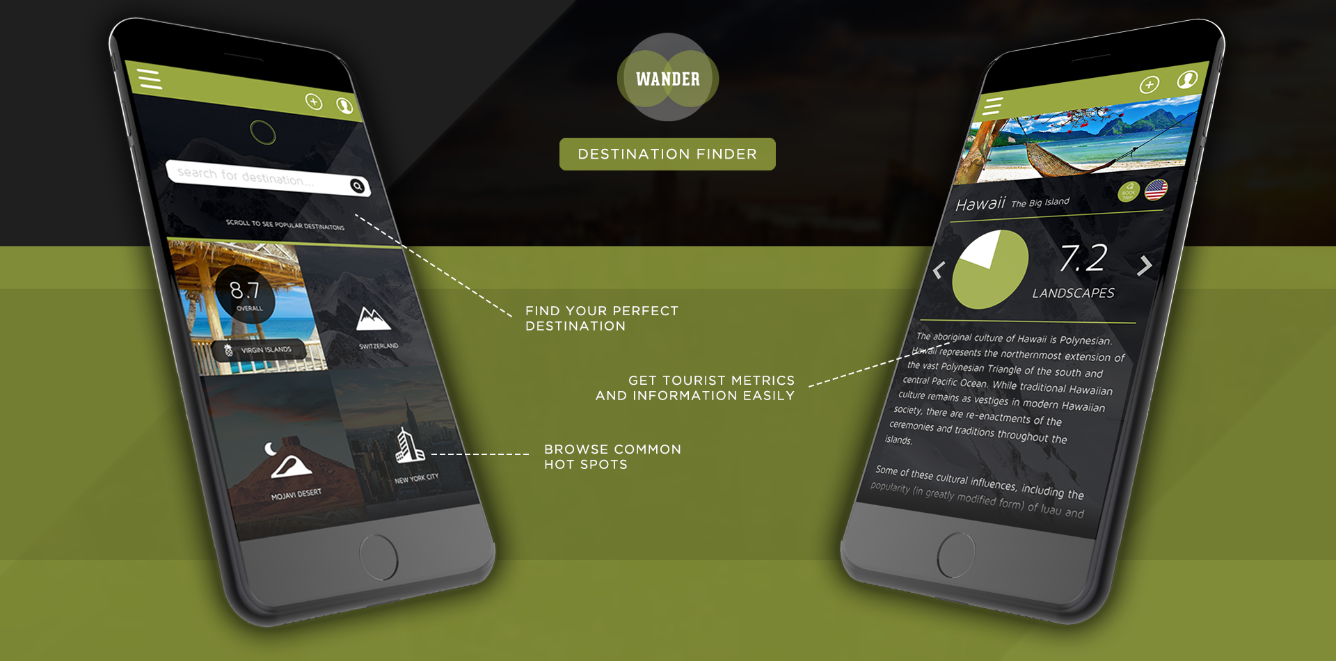Wander was developed as a solution for users that want to find destinations, compare prices on traveling to those destinations, and ultimately, if they'd like, book travel plans. The application design and content development was driven by field research, user mapping, and by examining existing processes within the travel booking industry. Wander is designed and functions on both mobile (iOS & Android) and web and looks to provide a seamless user experience between the two platforms.