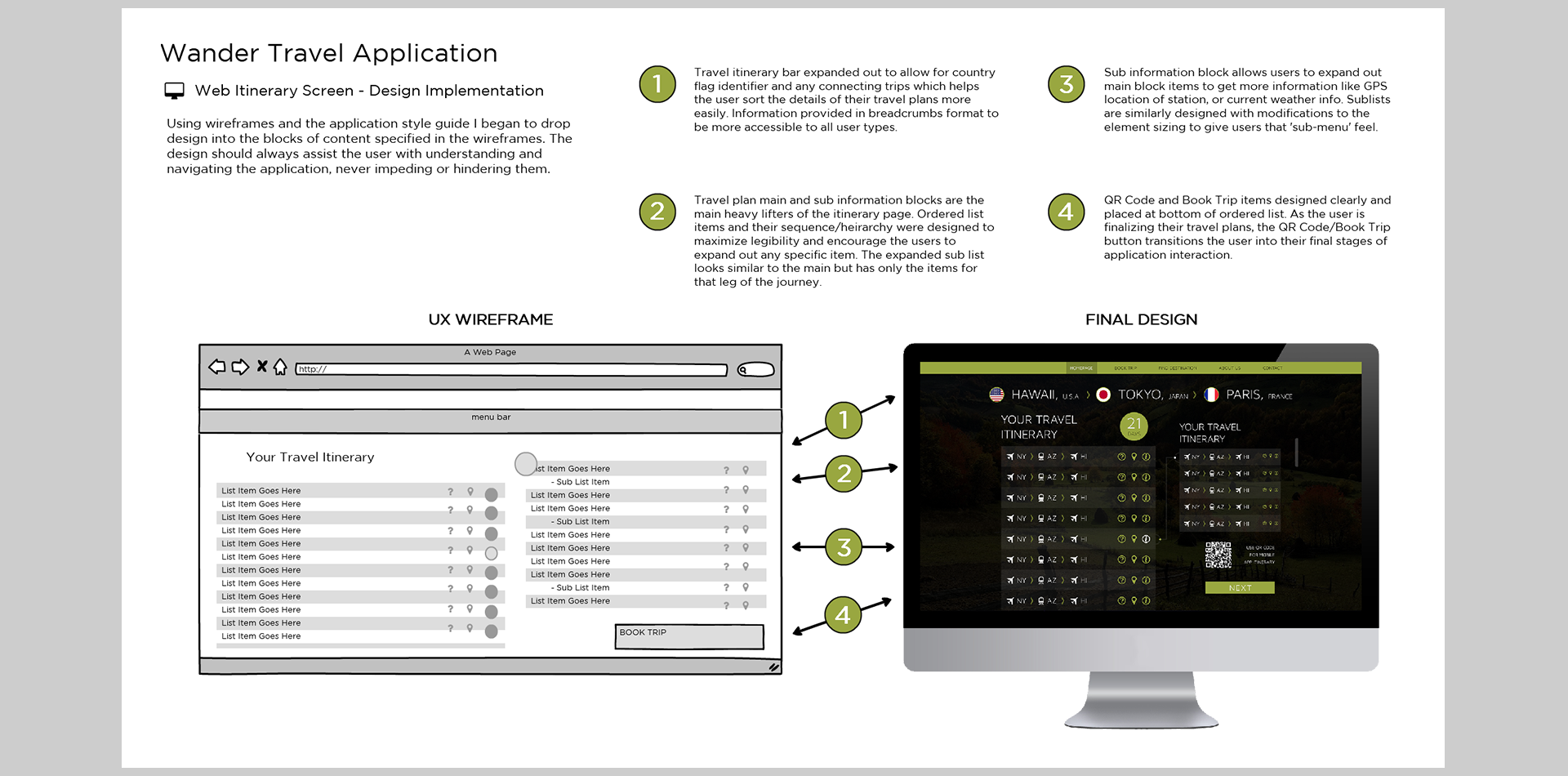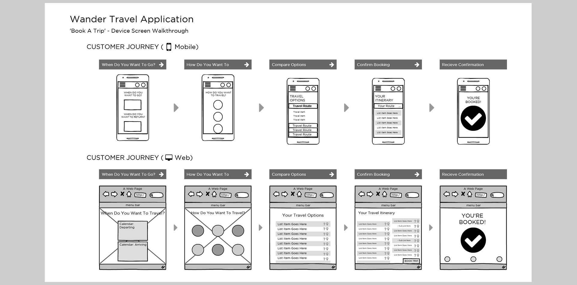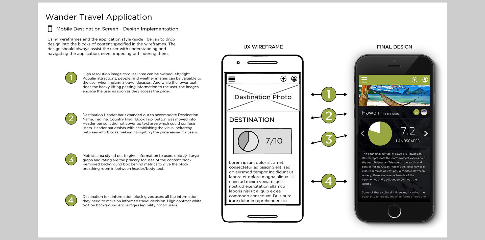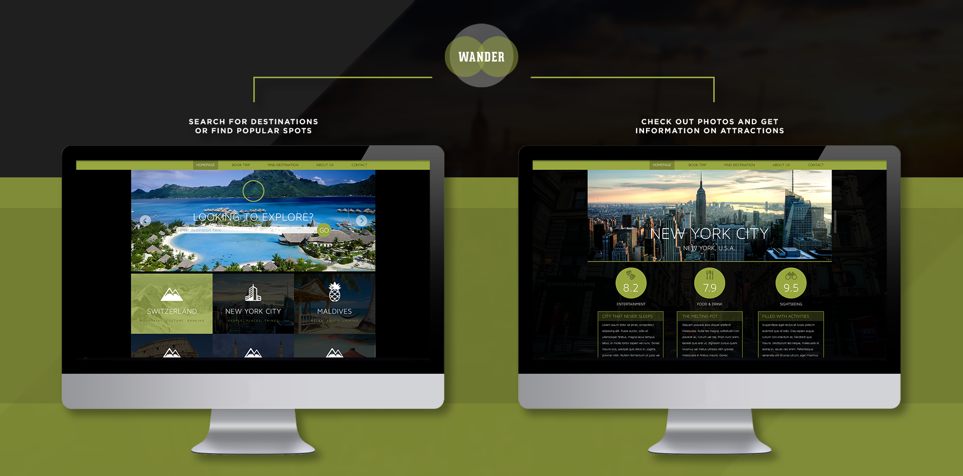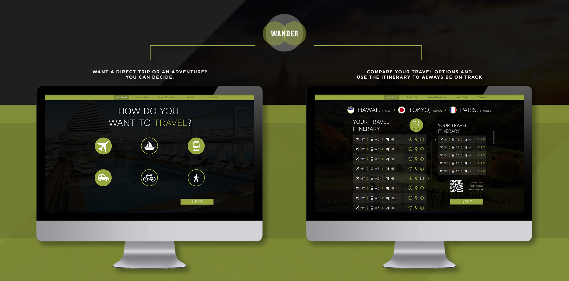 Wander was developed as a solution for users that want to find destinations, compare prices on traveling to those destinations, and ultimately, if they'd like, book travel plans. The application design and content development was driven by field research, user mapping, and by examining existing processes within the travel booking industry. Wander is designed and functions on both mobile (iOS & Android) and web and looks to provide a seamless user experience between the two platforms.