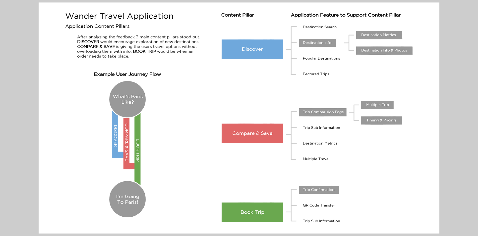 Once the research was examined I identified 3 content pillars that would exist to solve user needs: Discover (browse or search for a new place), Compare & Save (provide information for user to find best deal), and Book Trip (User books travel plans). These would serve as the main functions and user journeys for the application and warranted further process examination. Before I got too far though I wanted to take a step back and think about the potential user-base to make sure that I included features that would make sense for all types of users.