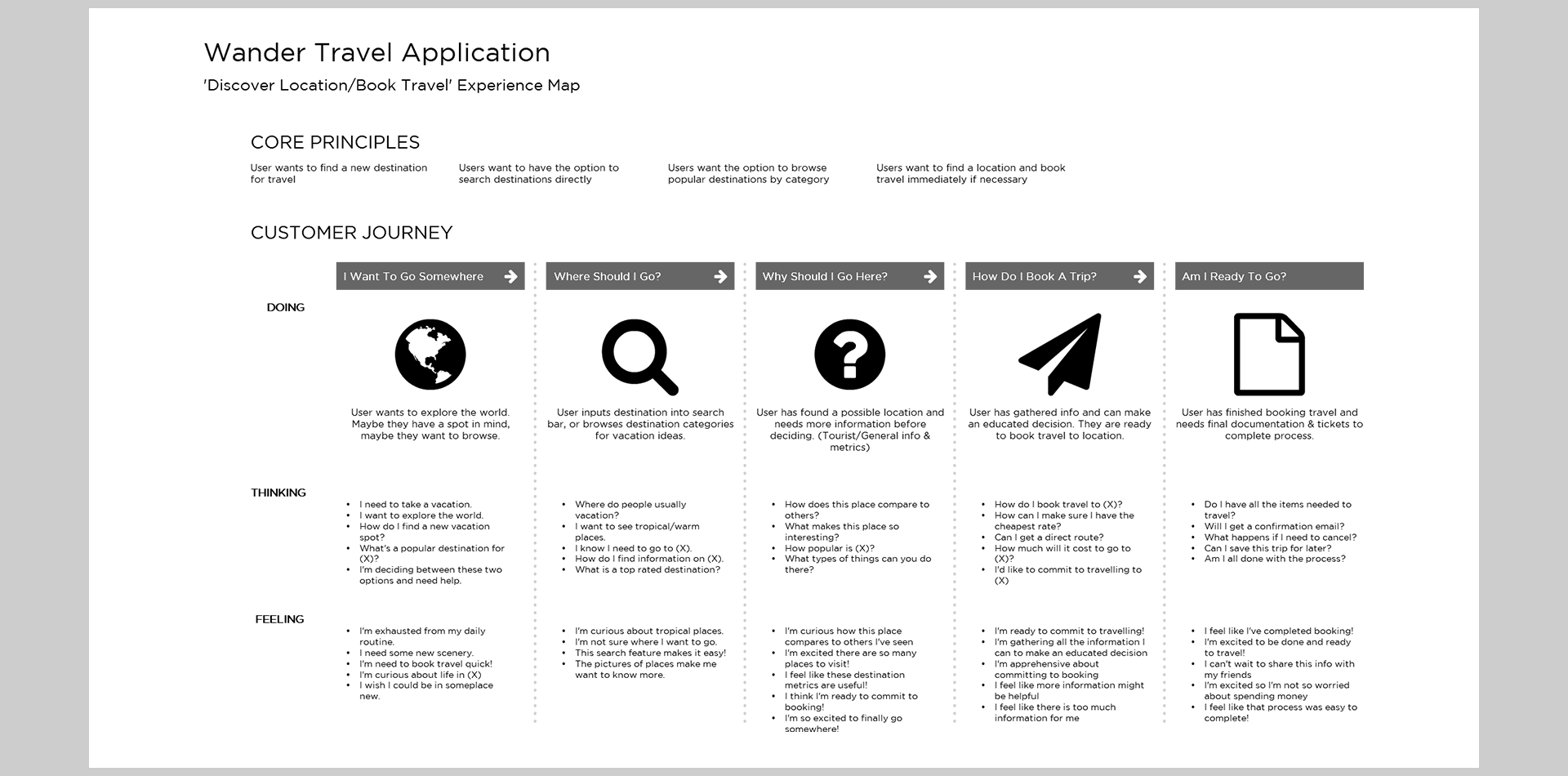 There were two main processes in the application that needed to be examined: the user wants to book a trip, and the user isn't sure where they want to go so they must find a destination and then book a trip. I decided to explore the core ideas of those processes and broke them out into user actions, thoughts, and feelings. The process studies followed the users journey from “I want to go somewhere” to “I'm booked and going” to ensure I was working with the complete spectrum of information.
