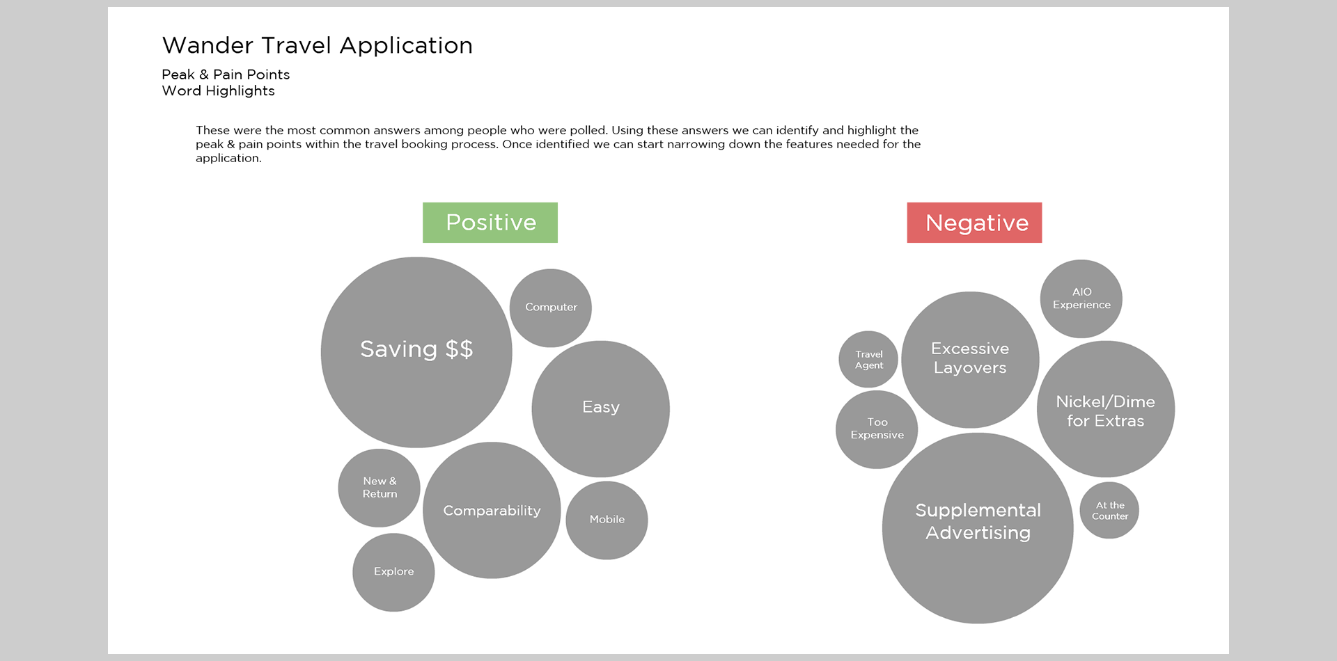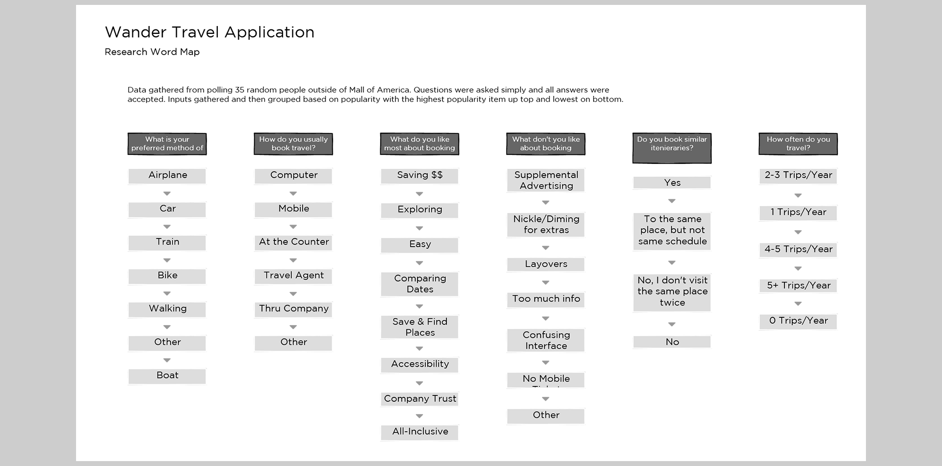 My initial research was polling 35 people at the Mall of America, I asked people some basic questions and allowed them to answer however they liked and logged all the answers. Once I had my data I began to reorganize it by the popularity of answers to help me better understand what the user needs. I was able to identify common 'peak' and 'pain' points among the answers and separated them out by grouping and looking at the groups a bit closer I could start to pinpoint the things the application needed in order to satisfy the users.