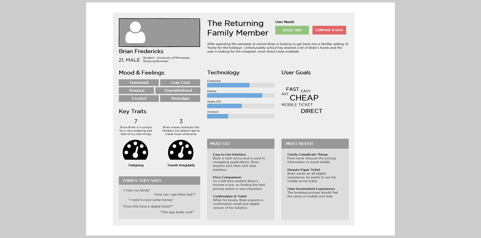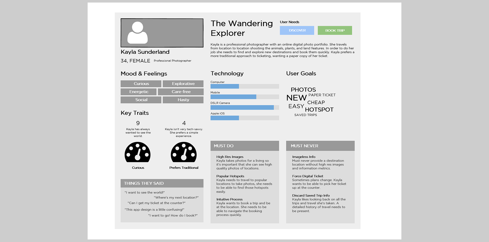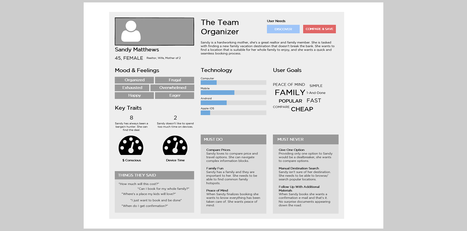 In order to get a better understanding of the user base I created a few user profiles, these profiles attempted to get into the mindset of a variety of users so that I could better gauge roadblocks or pitfalls the application needed to avoid to ensure a better user experience. I was able to create 3 diverse profiles with different backgrounds and needs: Brian the Returning Family Member (Book/Compare), Kayla the Wandering Explorer (Discover/Book), and Sandy the Team Organizer (Discover/Compare).